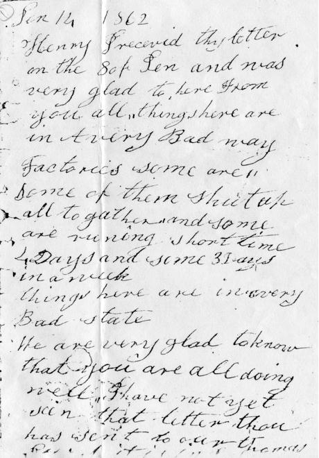 Henry, received thy letter on the 8th of ______ was very glad to here from you all. Things here are in a very bad way. Factories are some of them shut up all together and some are running short time 2 days and some 3 days in a week. Things have been in a very bad state. We are glad to know that you are all doing well. I have not yet seen that letter thou has sent to _____ Thomas but I will ____.