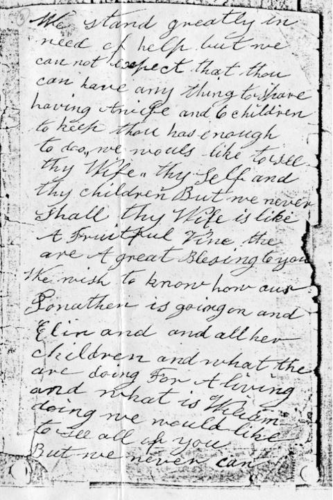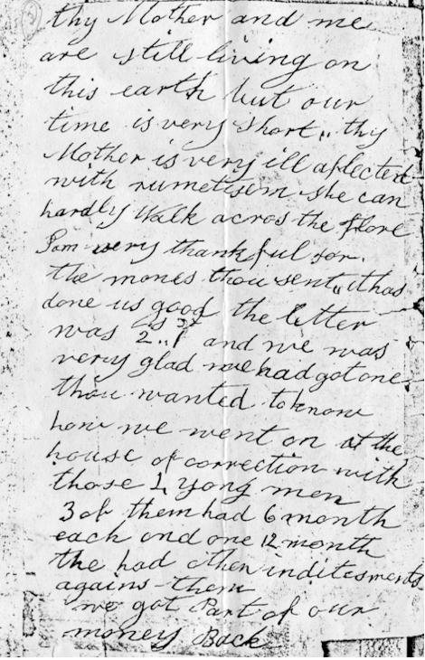 Thy mother and me are still living on this earth but our time is very short. Thy mother is very ill aflected with rumetisim. She can hardly walk acros the flore. I am very thankful for the mones thou sent. It has done us good. Thou wanted to know how we went on at the house of correction with those 4 young men. 3 of them had 6 months each and one 12 months. They had other inditements against them. We got part of our money back. We stand greatly in need of help but we cannot expect that thou can have any thing to share having a wife and 6 children to keep thou has enough to do. We would like to see thy wife, thyself, and thy children. But we never shall. Thy wife is like a fruitful vine. They are a great blessing to you. We wish to know how our Jonathan is going on and Ellen and all her children and what they are doing for a living and what is William doing? We would like to see all of you but we never can.