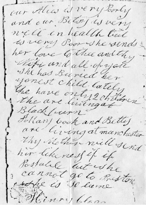 Our Alice is very poorly and our Betsy is very well in health but is very poor. She sends her love to thee and thy wife and all of you. She has buried her youngest child lately. She has only two children, they are living at Blackburn Fallan. Cook and Betty are living at Manchester. Thy mother will send her likeness if its possible but she cannot go to Preston she is so lame.